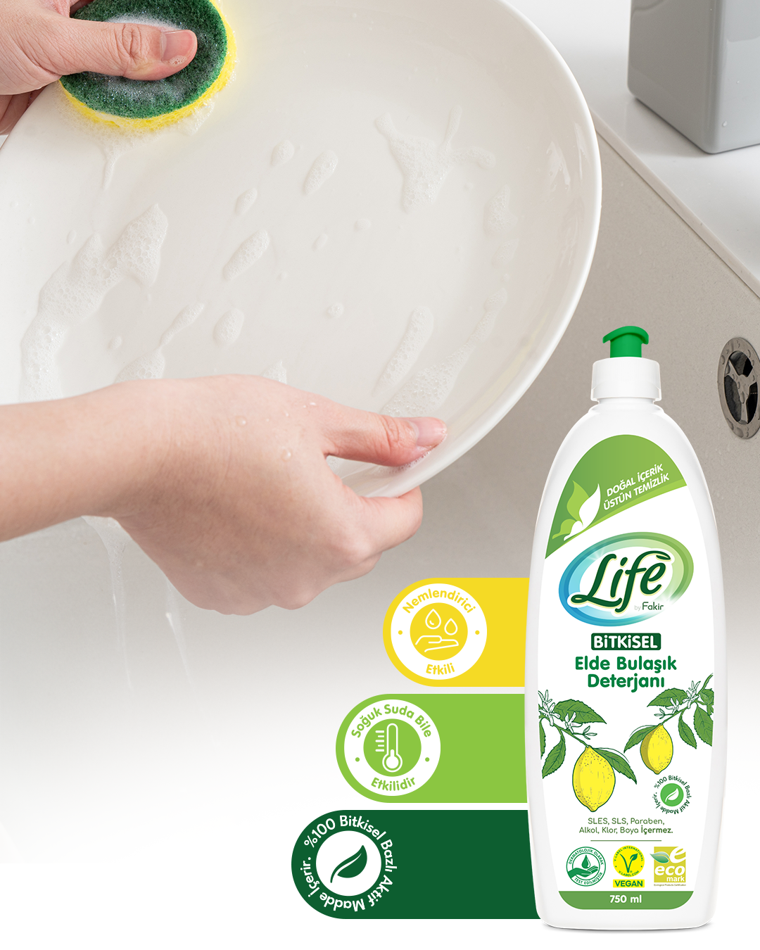 Gelecek nesillere daha temiz bir dünya bırakma vizyonuyla hazırlanan Life by Fakir Bitkisel Elde Bulaşık Deterjanı; SLES, SLS, paraben, alkol ve klor gibi zararlı kimyasallar içermiyor. %100 bitkisel bazlı aktif maddeleri sayesinde doğada kolayca parçalanabilen ürün, çevreye duyarlı bir yaşam tarzını destekliyor.