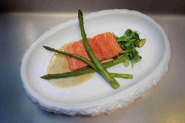 - Servis: Izgaralanmış kuşkonmaz ve çağlalı semizotu salatasıyla birlikte tabaklanarak servis edilir.