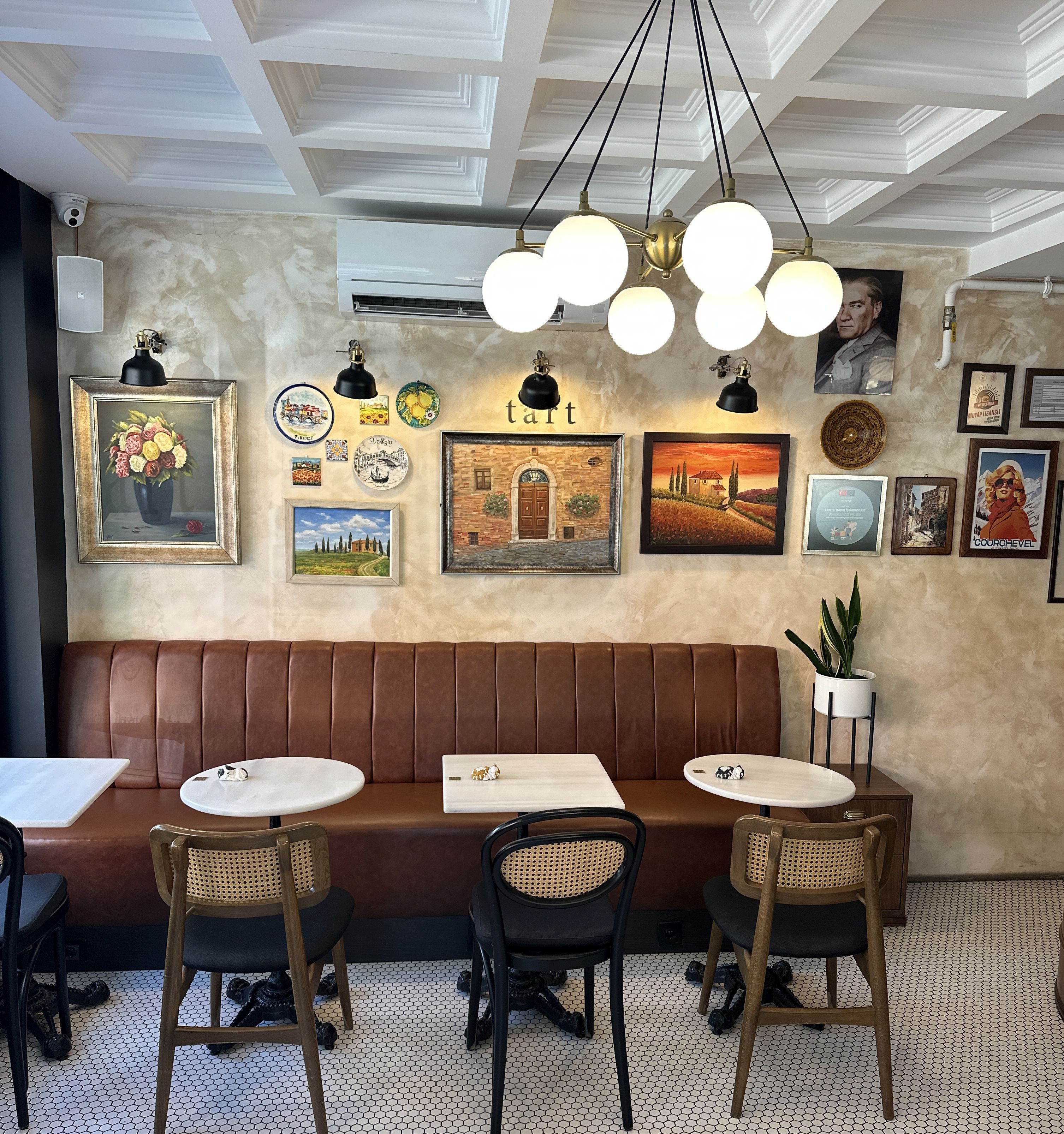 T’art’ın ismindeki “art” kelimesi rastgele değil. Müge Hanım’ın resim, müzik ve sanata olan tutkusu, mekanın her köşesine sinmiş durumda. Duvarları süsleyen resimler ona ait. Mobilyalar, objeler Avrupa bit pazarlarından toplanmış, her biri hikayesi olan parçalar. Müge Hanım, “Birinin evine, salonuna misafirliğe gitmişsiniz hissi uyandırsın istedim. Mekanım sadece güzel değil yaşanmış, samimi ve kişisel olmalıydı” diye konuşuyor.